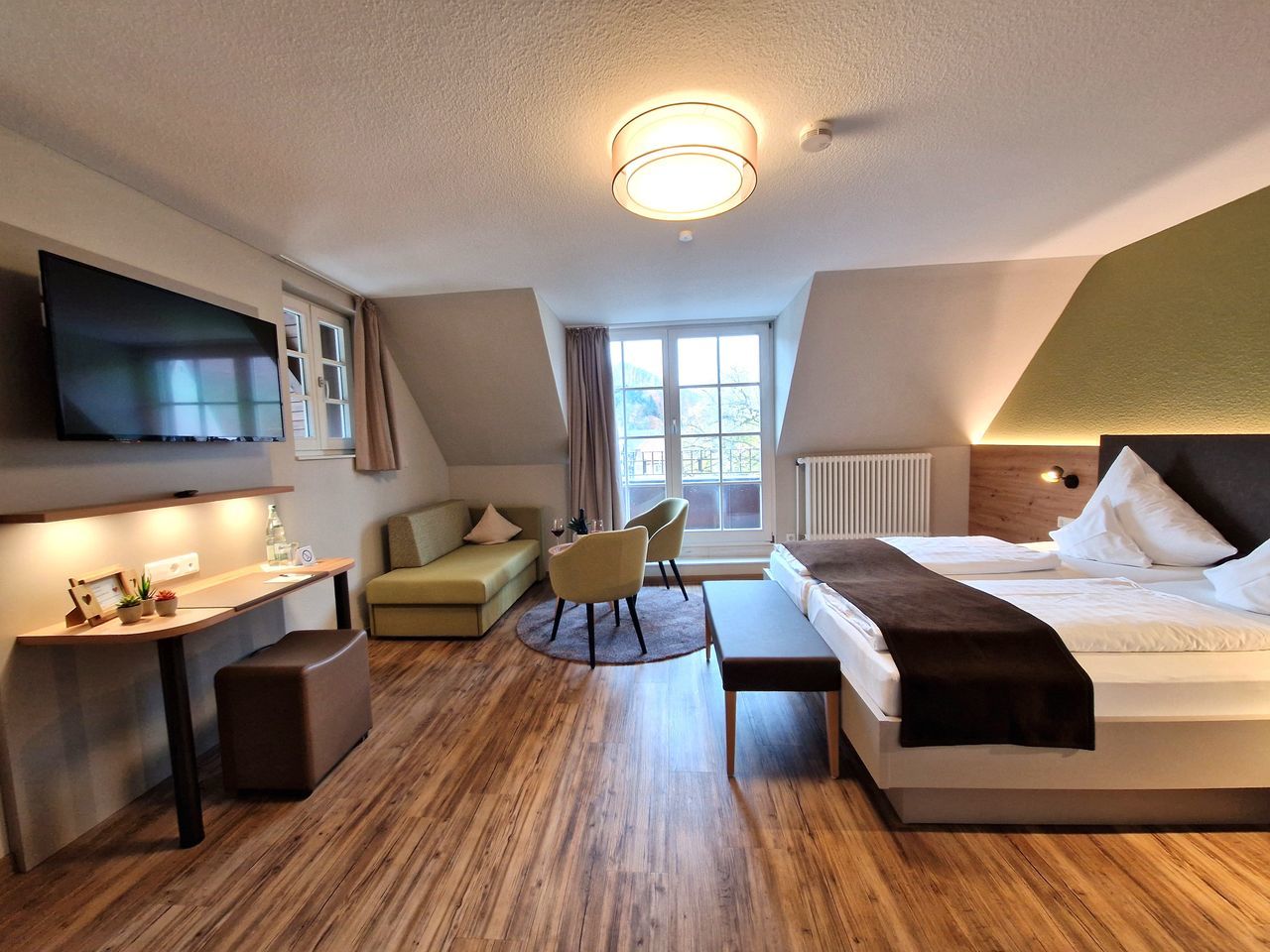 | Comfort Plus Zimmer mit Balkon | Die Comfort Plus Zimmer haben eine Größe von ca. 22m² und verfügen über ein Bad mit Dusche, Fön, Handtuchwärmer, Flat- Screen, W-LAN, Schreibtisch, Sofaecke und einen Balkon | 109 - 169 € in Einzelbelegung 129 - 189 € in Doppelbelegung 30 € für 1 Zusatzpersonen (nach Verfügbarkeit) |
